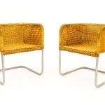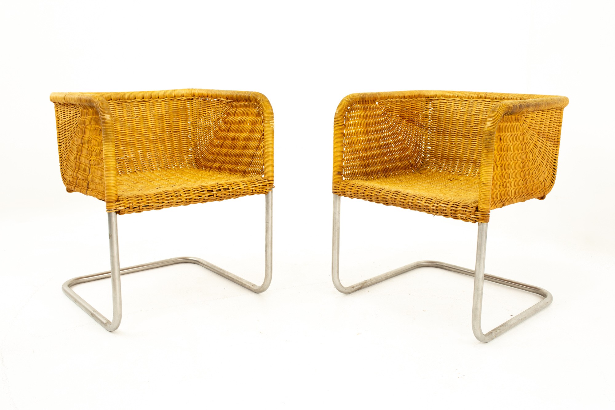 Harvey Probber Mid Century Wicker and Chrome Cantilever Dining Chairs - Pair