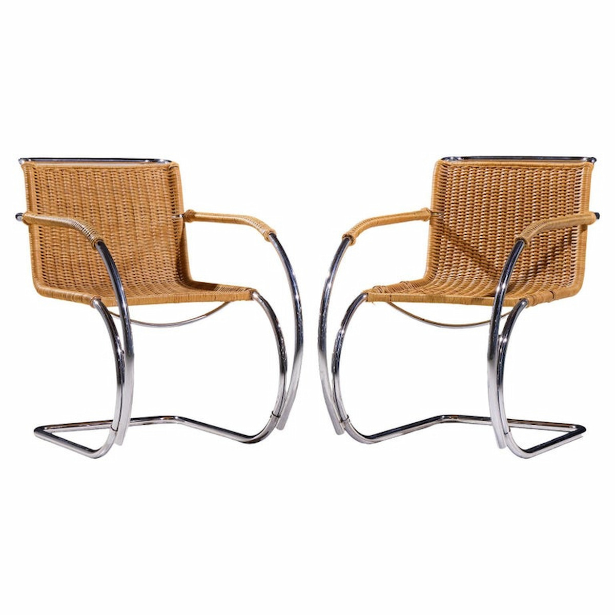 Mies van der Rohe for Knoll MR Mid Century Rattan and Chrome Chairs - Pair
