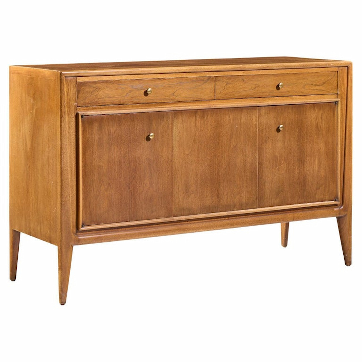 Excellent Vintage Condition – Very Minor Stain Wear on Top of Credenza. Minor Wear on Legs. Doors and Drawers Work Great. Credenza is Structurally Solid. Excellent Condition Overall.
