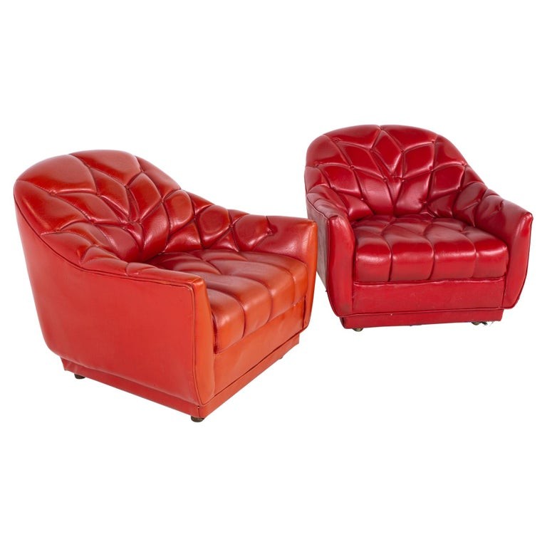 Vladimir Kagan Style Mid Century Tufted Red Naugahyde Lounge Chairs - A Pair